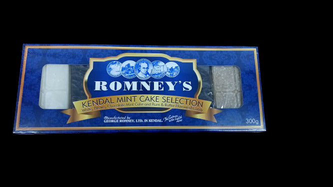 Kendal Mint Cake Selection Pack 300g Five individually wrapped bars of Kendal Mint Cake in white, brown and chocolate coated white, chocolate coated brown and a rum butter flavoured candy bar.